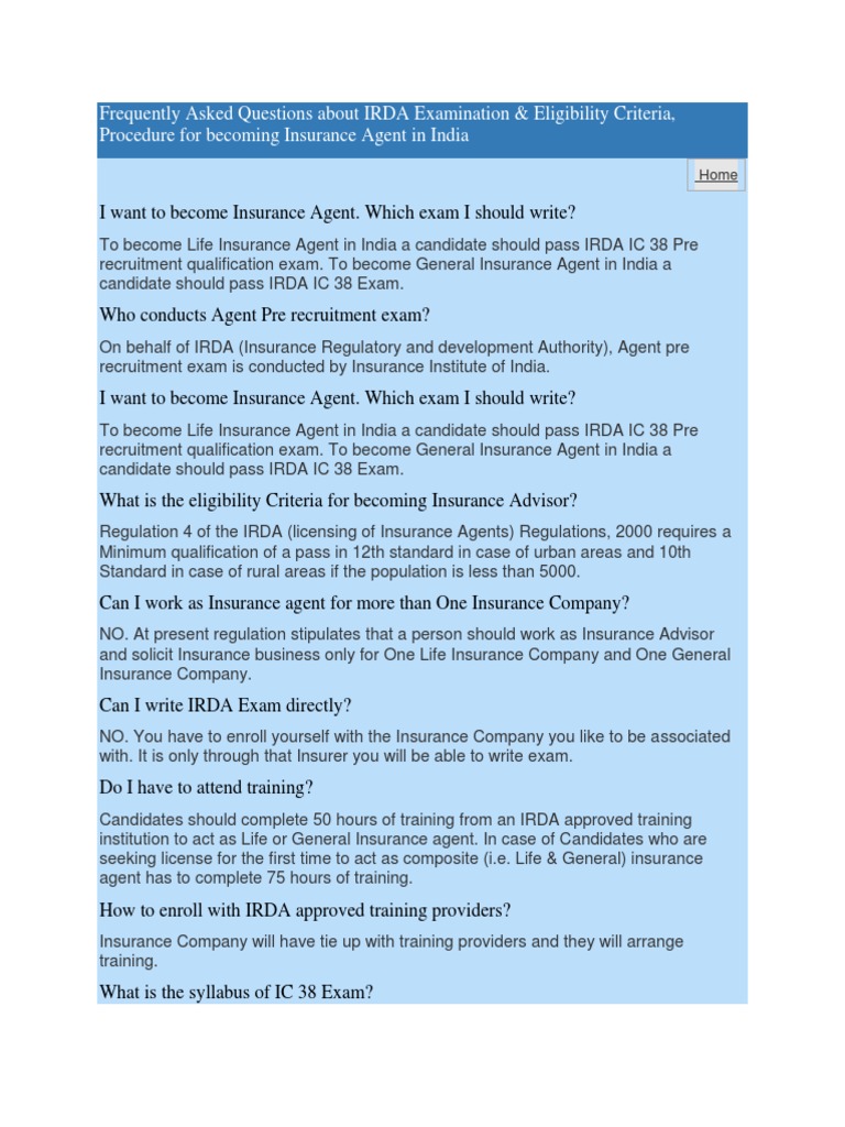 The exam is same as in life insurance or something else. Irda agent licensing exam paper 1 insurance works on the principle of a trust b sharing c randomness d all of the above 2 insurance is legitimate a when an adverse happening is likely b when an adverse. Life insurance general insurance health insurance agent exam mock test papers in english.